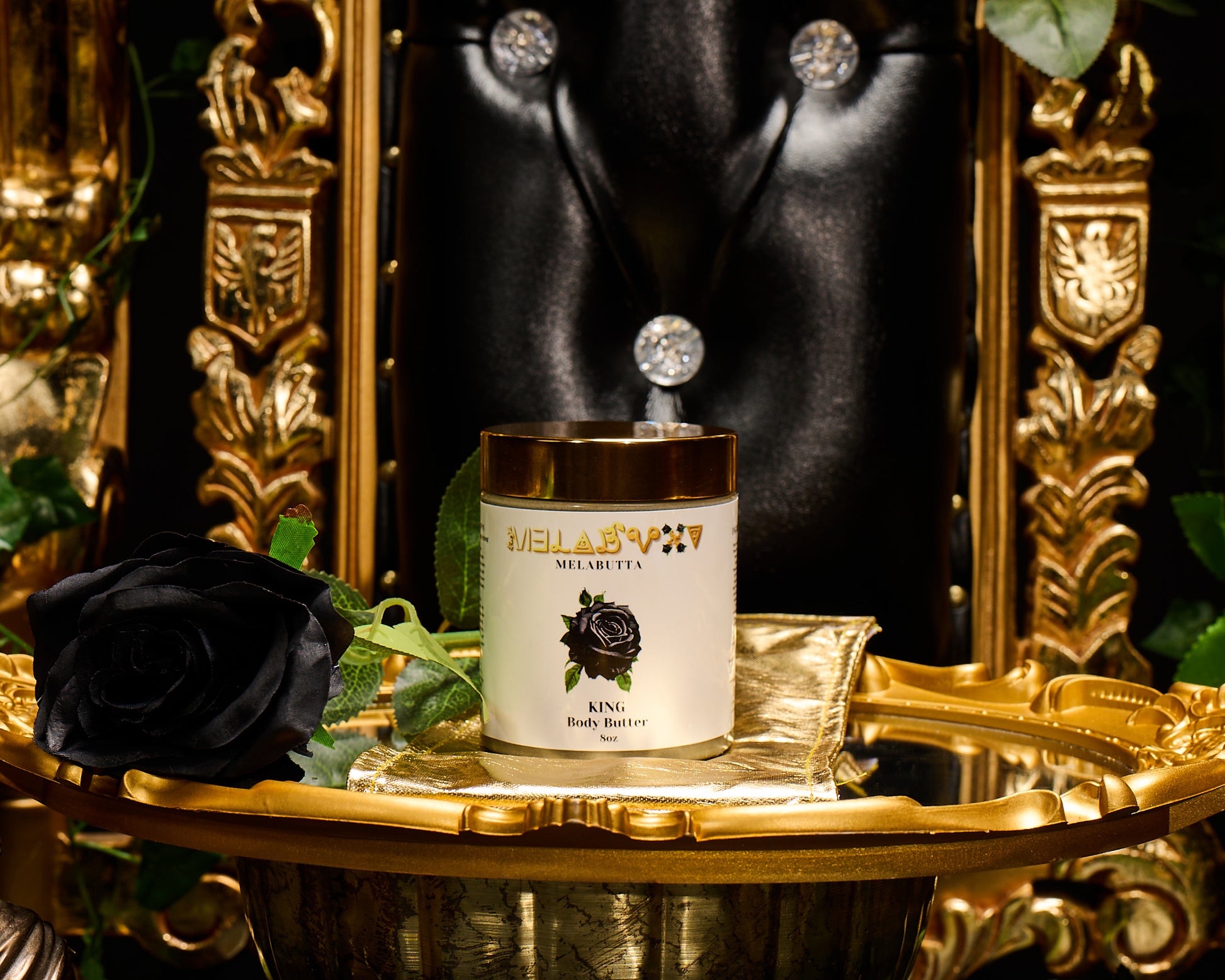 The KING Body Butter is a premium combination of Shea, Kombo, and Cocoa butter, expertly infused with Black Seed Oil to deeply nourish the skin and enhanced with Ashwagandha to maximize the benefits of each ingredient, revitalizing and nurturing the masculine essence.