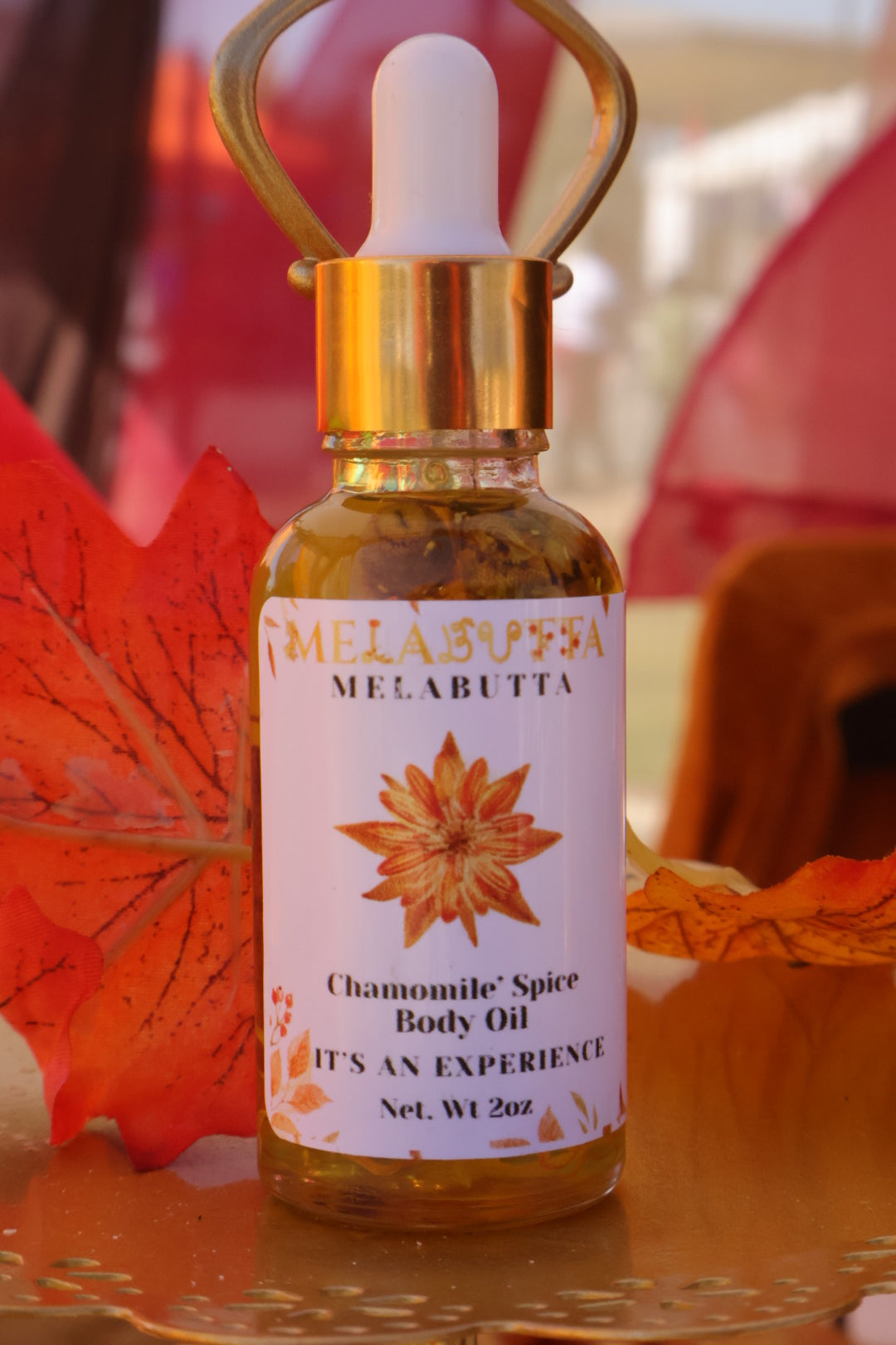 For a Luxurious Blend of Egyptian Chamomile, Cinnamon, and Fresh Turmeric infused with Raw Ghanian Cocoa Butter and hand-pressed Pumpkin Seed Oil. Experience the Chamomile' Spice Body Oil perfect for the Cozy Season.ย